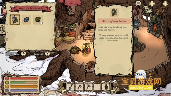 啮齿兽的稀有草药藏在你洞穴里阿姨的背包里。打开它,把里面的草药储藏品拿出来,转移到你的背包里(而不是你洞穴里的储藏室)。