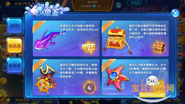 玩家点击左上方的三角形打开“更多”页面,点击“鱼鉴”,即可查看鱼类的图鉴,了解捕鱼信息,让你更好的进行鱼类的捕捉,获取更多金币钻石。