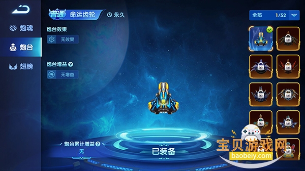 玩家点击左上方的三角形打开“更多”页面,选择炮台,即可进入炮台页面,可以查看炮台信息和切换。