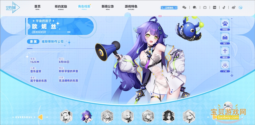 核心信息:身高152CM,生日8月8日,擅长聆听宇宙的声音,喜欢属于自己的东西,讨厌无法拥有的事物,隶属维斯特利制作公司。