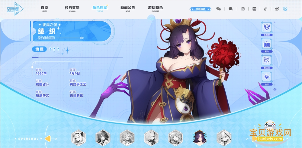 核心信息:身高166CM,生日1月6日,擅长绳结手工艺,喜欢花瓣占卜/祈愿符咒,讨厌白色的花。