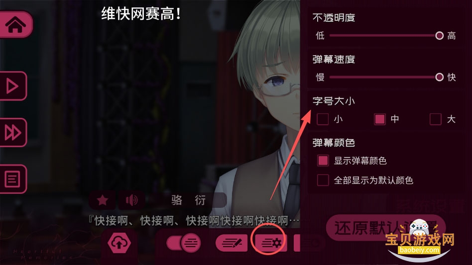 4、此外,玩家也可以根据个人喜好,自定义弹幕文字内容,并调节透明度、移动速度、字体大小及颜色等参数,实现更个性化的显示效果。