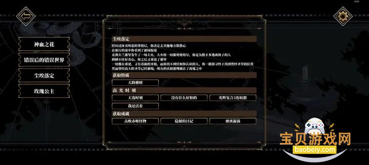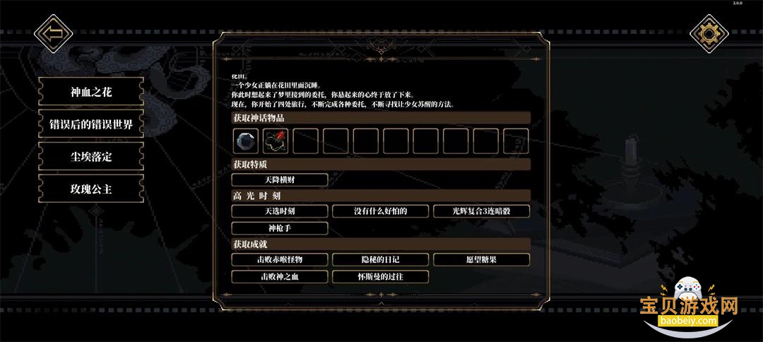 出来之后去右上角房间打怪获得一个线索,然后去右下角房间墓园拿,在桌子上拿到糖果线索,查看可以获得神话物品尸鬼教典。出来先找富商女儿对话,帮忙隐瞒,找富商对话,下毒,隐瞒他女儿的细节,出去被怪追上选上去帮忙打3个怪。躲箱子里躲过追来的三个人之后把门口的打了,进房间,把内脏拿了扔进血池,不要抵抗,然后就能见到哚哚了,顺便获得一个特质。先找哚哚对话,再分别触发头骨,蒲公英,触手的对话,选择留下来,和哚哚对话帮忙取下项链,打神之血获得神话物品血之花,从黑洞出去。注意不要碰到白色孢子,实在躲不过就用火点了再过去。去之前讲台暗道那里面,把主教和诺拉打了,之后出去找人分别对话完事走人触发结局玫瑰公主。