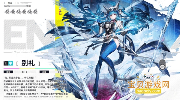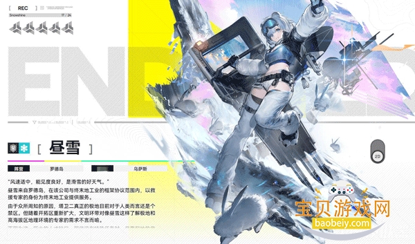 救援专家,喜欢冰雪和雪山,不想让极端气候给人带来痛苦,还编写了极地生存指南。定位是盾卫,能抗伤、能治疗还能输出,“防卫姿态”可减伤反击,“应急救援”能给队友回血。