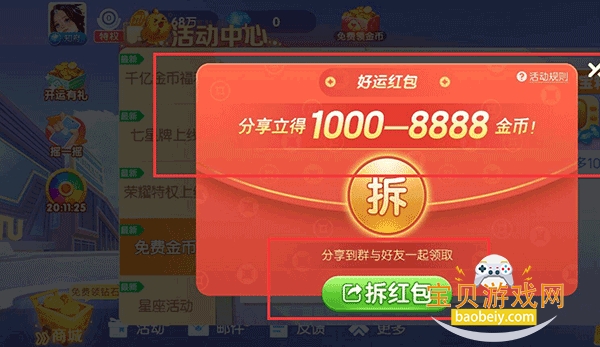 3、好运红包。分享到好友和群即可一起拆红包得金币