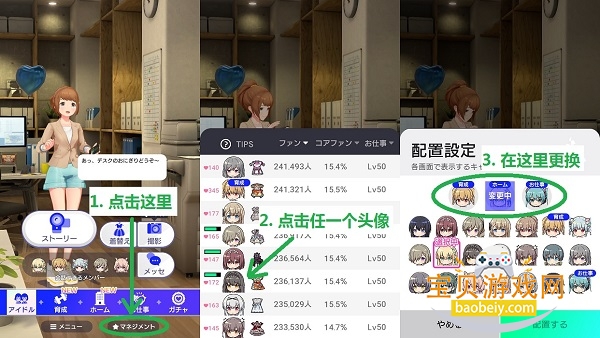 可以在底部菜单里更换“育成”、“首页”、“工作”3个地方的偶像(可以设置固定偶像固定衣装/固定偶像随机衣装/随机偶像及衣装),步骤如下: