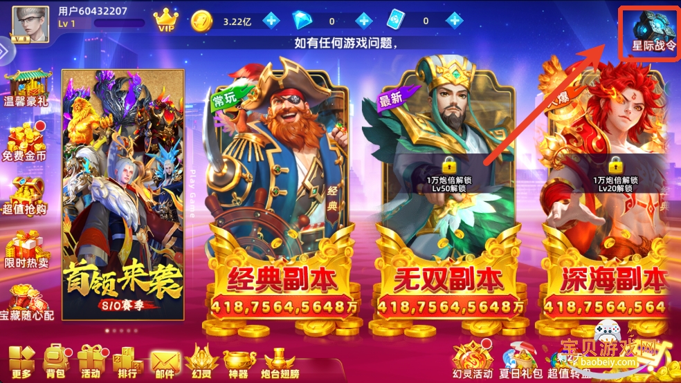 1、点击右上角星际战令,需要提前下载好资源才能成功进入。