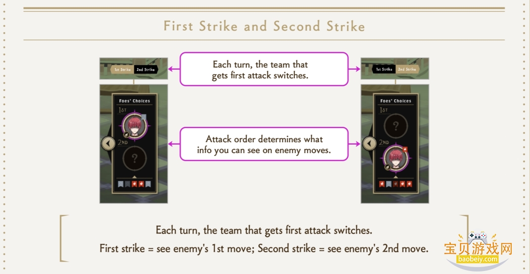 每回合中,双方各抽取两张卡牌进行一对一对抗。首回合由玩家先攻,之后双方交替获得先手权。