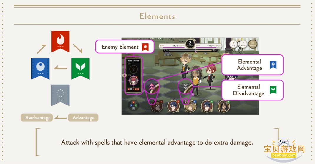 角色根据元素属性组成队伍,参与战斗(类似策略RPG),技能与组合策略会影响战斗结果。