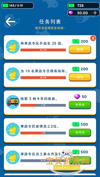 1、进入我要开超市最新版游戏后,完成日常任务和目标任务可获得大量钞票奖励。