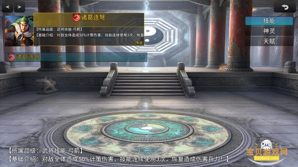 6、注:查看武将详情的时候需要双击选项才会显示下一步(双击技能,下方武将亮起才可点击),比如下图的物品、技能、装备等,以及技能、神灵、天赋等。