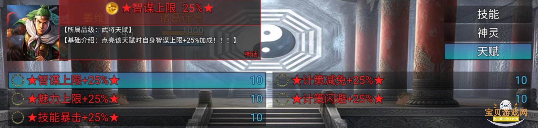 4、天赋:智谋上限+25%计策减免+25%魅力上限+25%计策闪避+25%技能暴击+25%