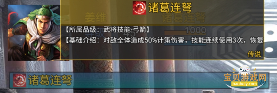 诸葛连弩:对敌全体造成50%计策伤害,技能连续使用3次,恢复造成伤害兵力!