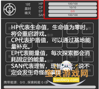 3、HP代表生命值,生命值为零时,将会重启游戏;CP代表护盾值,可以通过基地能量补充;EP代表能量值,每次探索都会消耗固定的能量;SAN代表理智,理智太低,说不定会发生奇怪的事情