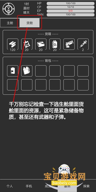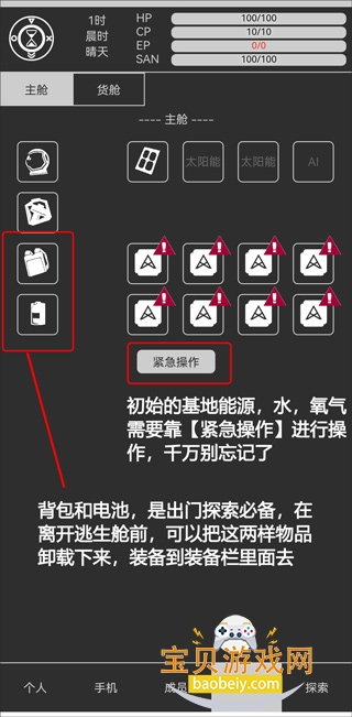1、初始的基地能源,水,氧气需要靠【紧急操作】进行操作,干万别忘记了。背包和电池,是出门探索必备,在离开逃生舱前,可以把这两样物品卸载下来,装备到装备栏里面去