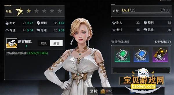 点击右上角的加号图标,可对船员进行升级或升星以提高船员属性。升级需要消耗作战数据。作战数据分为三种品质,品质越高,使用时给船员增加的经验值越多。所有船员初始星级一致,可以通过升星系统提升至最大星级。