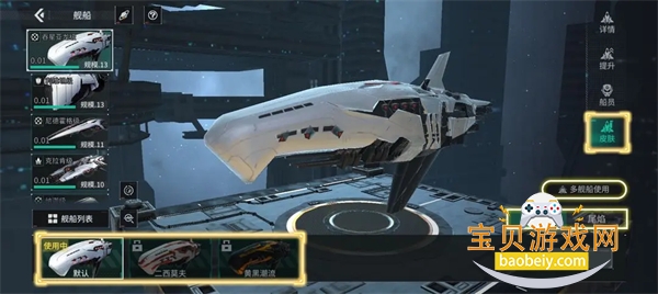 点击【舰船皮肤】页面可自定义舰船皮肤,皮肤分为船身和尾焰,点击多舰船使用可批量应用皮肤。