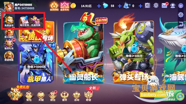 打开一起玩捕鱼,进入主页,点击右上角免费金币图标,选择礼品兑换