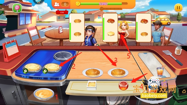 2、然后根据客人点的餐食来制作,这里小编教你们制作一个番茄酱的披萨和芝士酱的披萨吧,先点选择加水拌好的面粉,之后点击桌子上的烙饼铁,等待饼烤熟之后再选择它放到空盘子那里,然后点击番茄酱加上番茄酱这个番茄酱披萨就做好了,最后点击点了这份餐的客人,这样客人就获得自己想要的食物啦,你也会获得相应的金币。