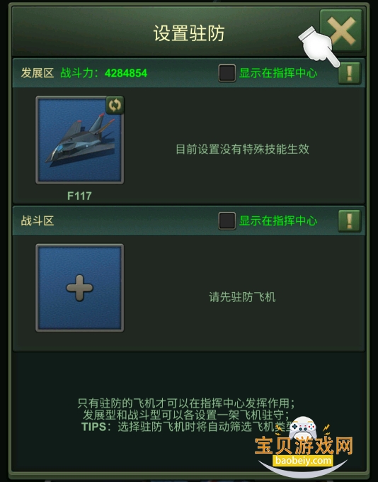 注意:并非所有飞机都可驻防在发展区,只有发展型飞机可驻防发展区,目前有:吸血鬼、F117、S-Wing、狂风、幽灵突击空艇。
