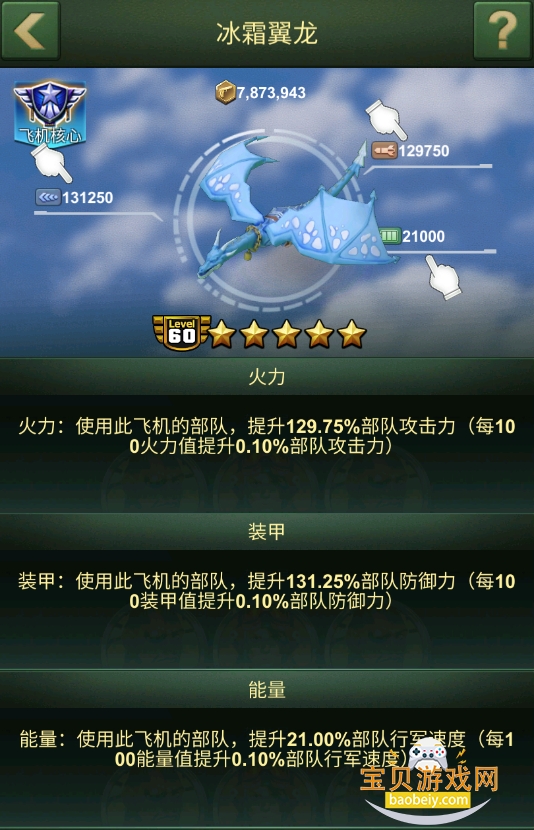 飞机驾驶员能够为飞机提升能量、火力、装甲值(能量会增加该飞机的行军速度、火力增加攻击力、装甲增加防御力)