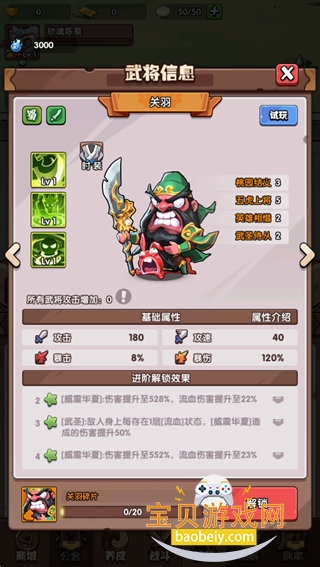 关羽:释放[威震华夏]技能时有20%几率返还100%的技能冷却