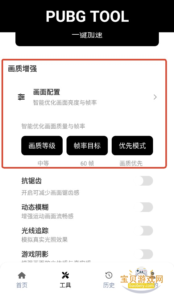 下滑找到【画质增强】,点击【画面配置】,可以设置画质等级、帧率目标和优先模式,这是能提高画质的主要设置。