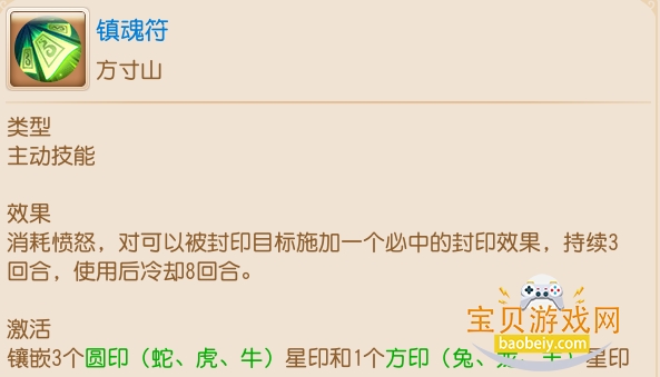 除了装备和召唤灵上的调整,星印的搭配在实力的提升上也是非常重要的。方寸山目前星印技能的选择,主要偏向于主动技能镇魂符,必定封印中且没有负面效果的技能,对于一个封系门派是必不可少的。