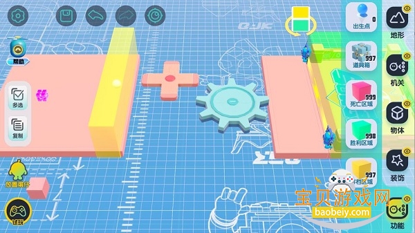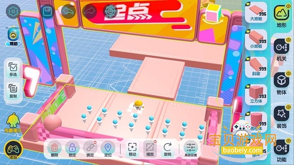 【地形组件】是构成关卡地图的基本组件,通过单指拖拽将地形组件放置在场景中,通过下方的操作栏,可以对选中的组件进行移动、缩放和旋转操作(默认的地形组件也同理哦),场景左边有复制按钮,以便快速复制组件。