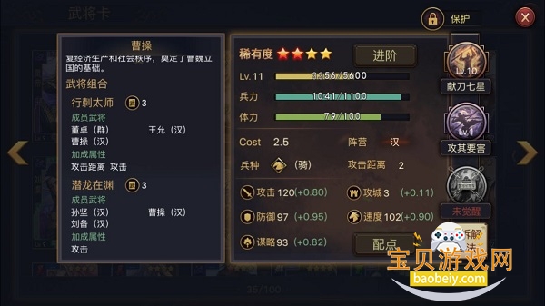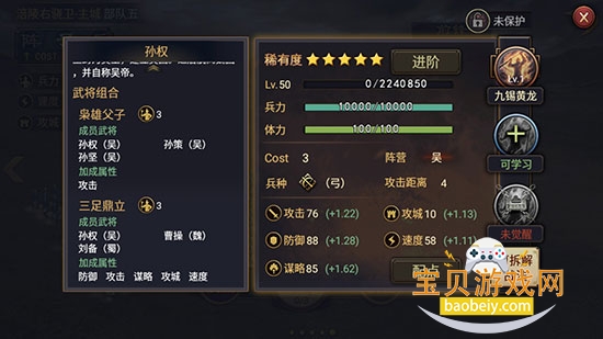 1)“潜龙在渊”组合:部队武将组合孙坚、曹操、刘备,加成“攻击”属性;