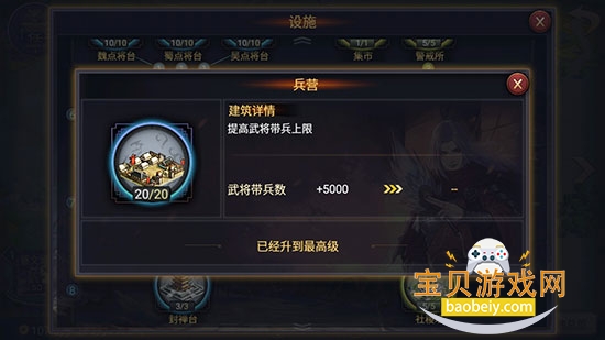 1) 兵营:增加部队兵力的核心建筑,兵营升级可提高武将带兵上限,部队总兵力数将急剧突破,极大增强部队战力;