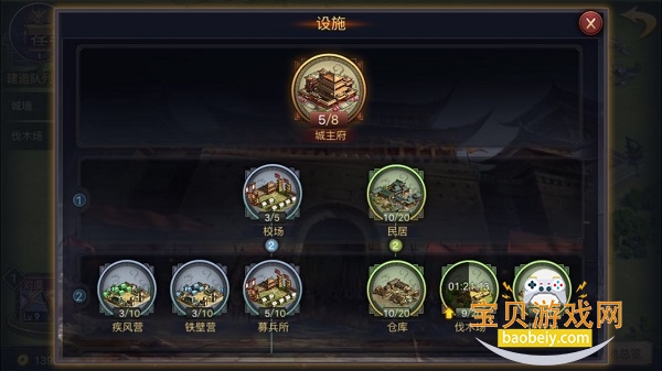 3) 募兵所:开启征兵,缩短征兵时间,加快速度补充队伍兵力;