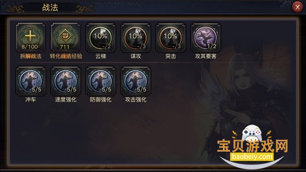(2)增强武将战法:可提高战斗中武将释放战法的伤害值,在战斗中往往起到关键作用。战法可通过消耗技巧值升级,可通过消耗武将卡转化。