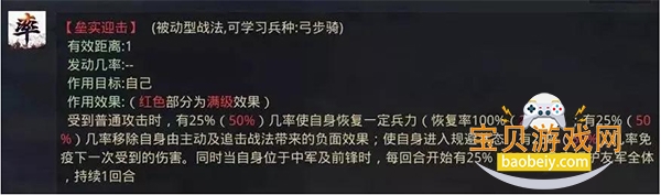 【垒实迎击】每回合拥有50%几率的援护效果,受到普通攻击时就有50%几率移除由主动战法、追击战法带来的“负面效果”,同时还有50%几率进入规避状态,免疫下一次伤害,50%几率能恢复自身一定兵力。