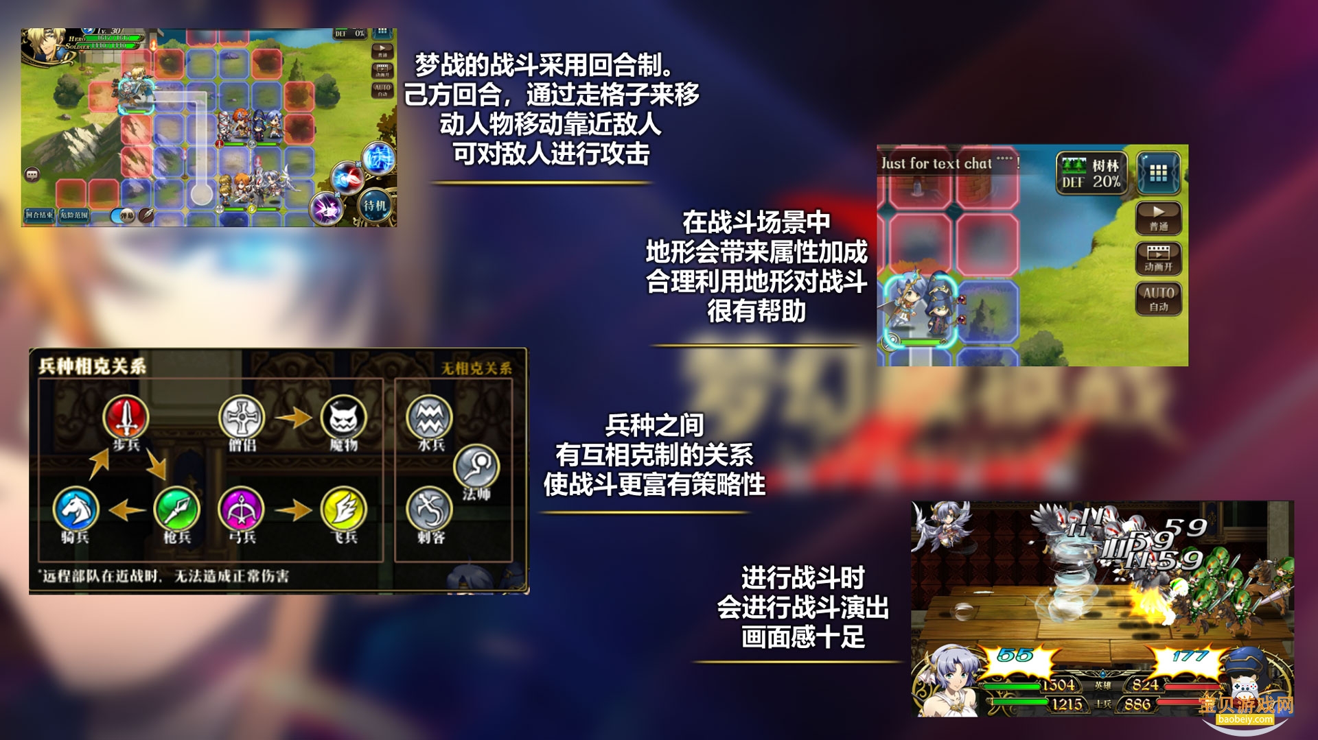 【梦幻模拟战】的战斗系统采用回合制,己方回合中,通过走格子移动人物来攻击敌人,同时战斗系统中的地形加成,兵种克制的系统使游戏的战斗更加富有策略。
