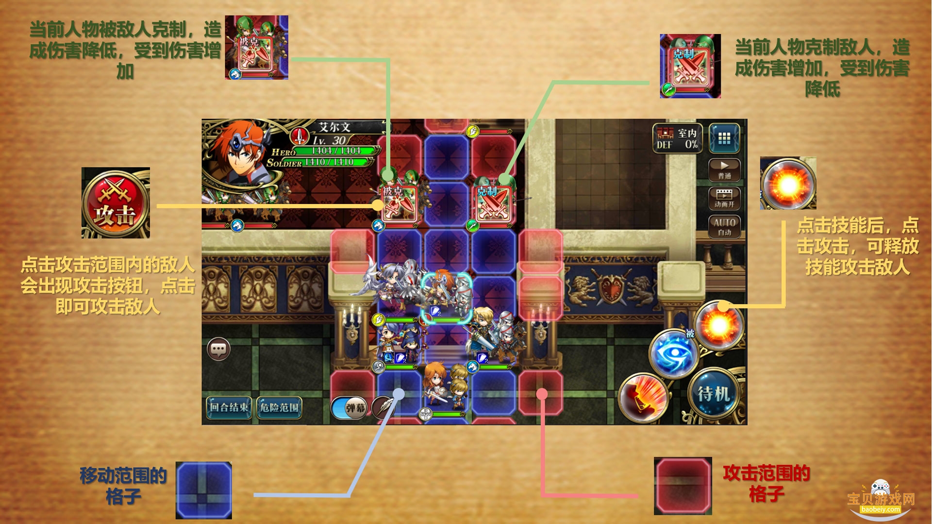 点击英雄,蓝色的格子为英雄可移动的范围