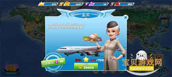 飞机大厨目前出了十多个机场,个人觉得新手解锁顺序可以是丹佛,悉尼,纽约,伦敦……那么我们如何解锁机场呢?如果你的星星够了,可以直接花金币解锁机场,如果星星不够而你想玩这个机场,可以花费90钻提前解锁,关于星星的数量可以查看左上角