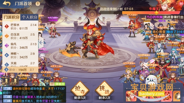 门派Boss是奖励种类最多的活动,千万不要错过。活动持续10分钟,每个人可以挑战Boss 3次,抢夺其他门派积分3次,最终积分总和(与参与人数、参与人战力相关)决定门派拍卖的奖励丰厚程度。