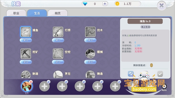 3、技能界面可以学习各种技能,通过切换到下方快捷栏进行装备。
