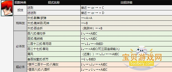 技能:最终决战奥义·无式、百二十连段、百式·鬼烧、大蛇薙、R.E.D.KICK、二百十二式·琴月阳。