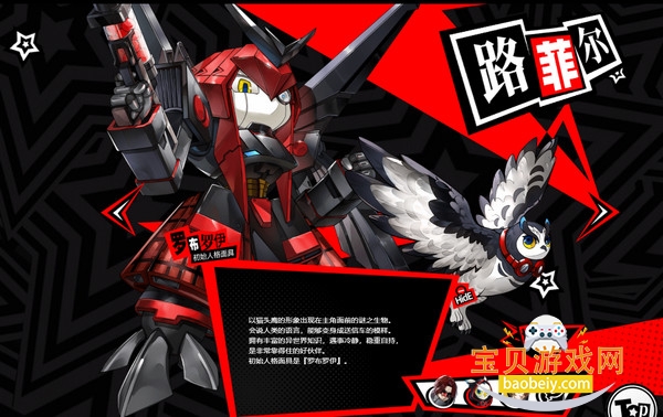以猫头鹰的形象出现在主角面前的谜之生物。会说人类的语言,能够变身成送信车的模样。拥有丰富的异世界知识,遇事冷静,稳重自持,是非常靠得住的好伙伴。初始人格面具是『罗布罗伊』。