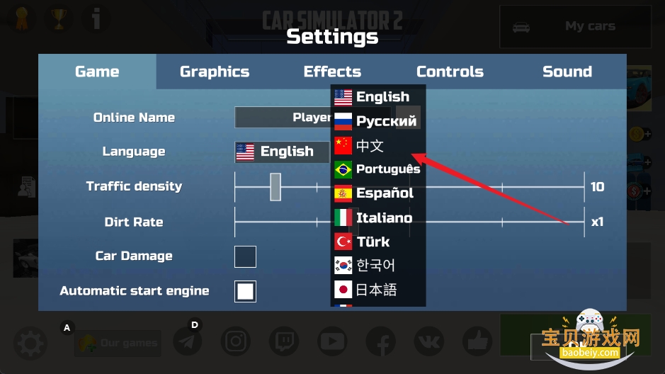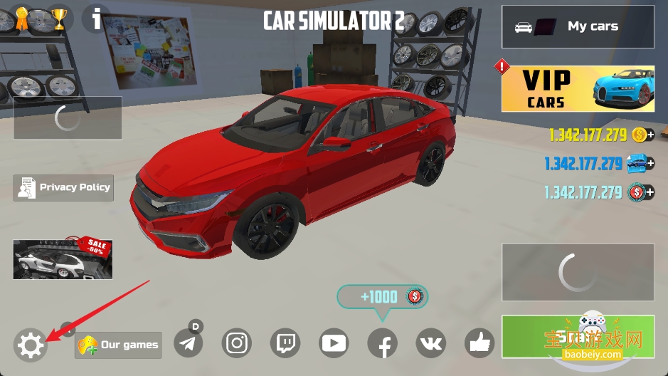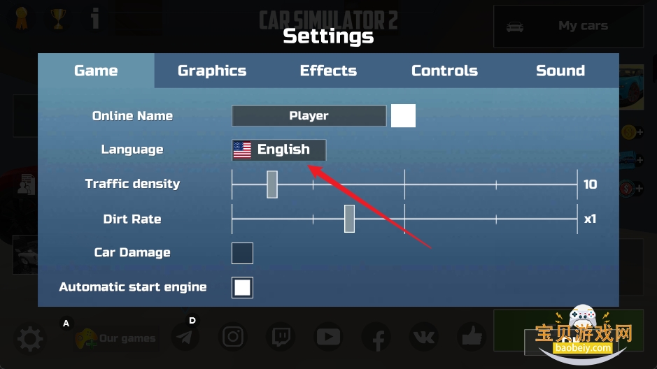 1、进入汽车模拟器2手机版后,点击左下角的齿轮图标进入【设置】。