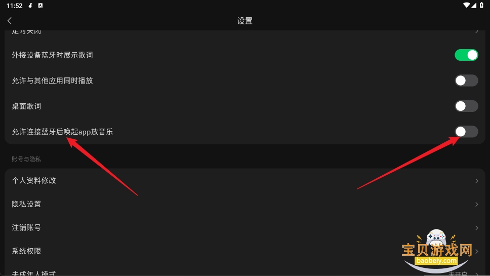 3、滑到底下,找到允许连接蓝牙后换起App播放音乐即可