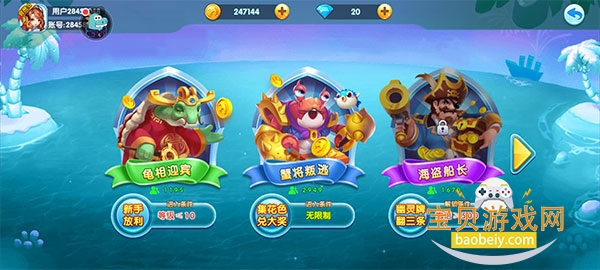 1、首先我们现在看到的是鱼乐达人高爆版新手专区模式,并且包括了龟相迎宾、蟹将叛逃、海盗船长等三个不同条件的玩法模式。