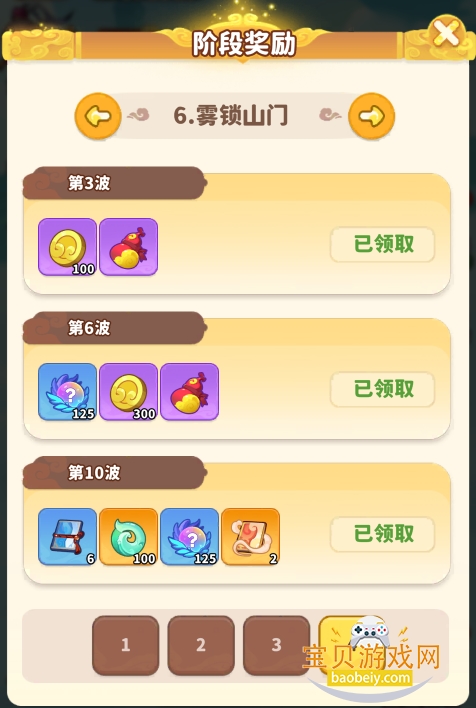 每章击败第3/6/10波怪物侵袭,均可在战斗后领取奖励。