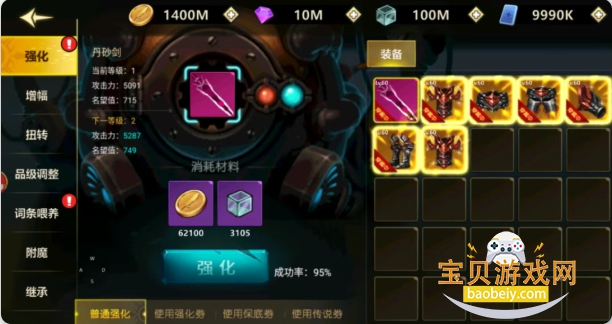 ②强化:消耗强化素材,提升装备的基础属性强化有概率失败且回退强化等级,可使用强化保底券来降低强化失败带来的损失。