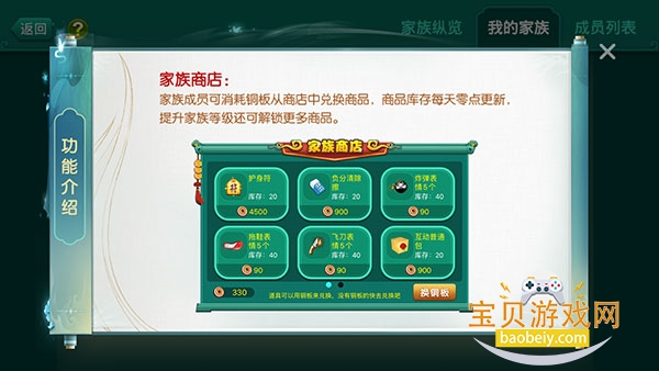 家族成员可消耗铜板从商店中兑换商品,商品库存每天零点更新,提升家族等级还可解锁更多商品。