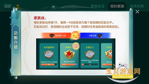 每轮家族战持续7天,每周一9点由系统为每个家族随机匹配对手。匹配成功后,系统随机生成若干任务,结算时任务进度高的家族获胜。
