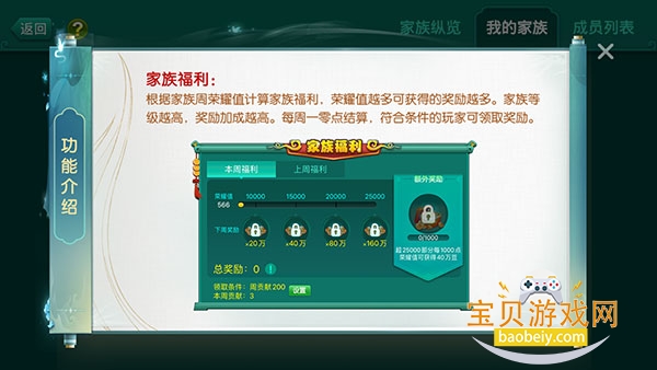根据家族周荣耀值计算家族福利,荣耀值越多可获得的奖励越多。家族等级越高,奖励加成越高。每周一点结算,符合条件的玩家可领取奖励。