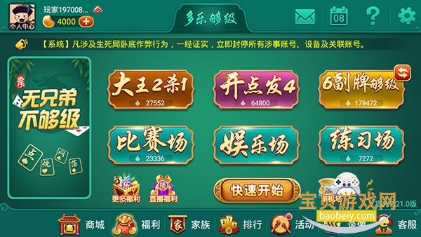 不仅包含开点发4、大王2杀1玩法,同时各玩法还分别有进贡、非进贡场次,多种够级游戏玩法任君选择。